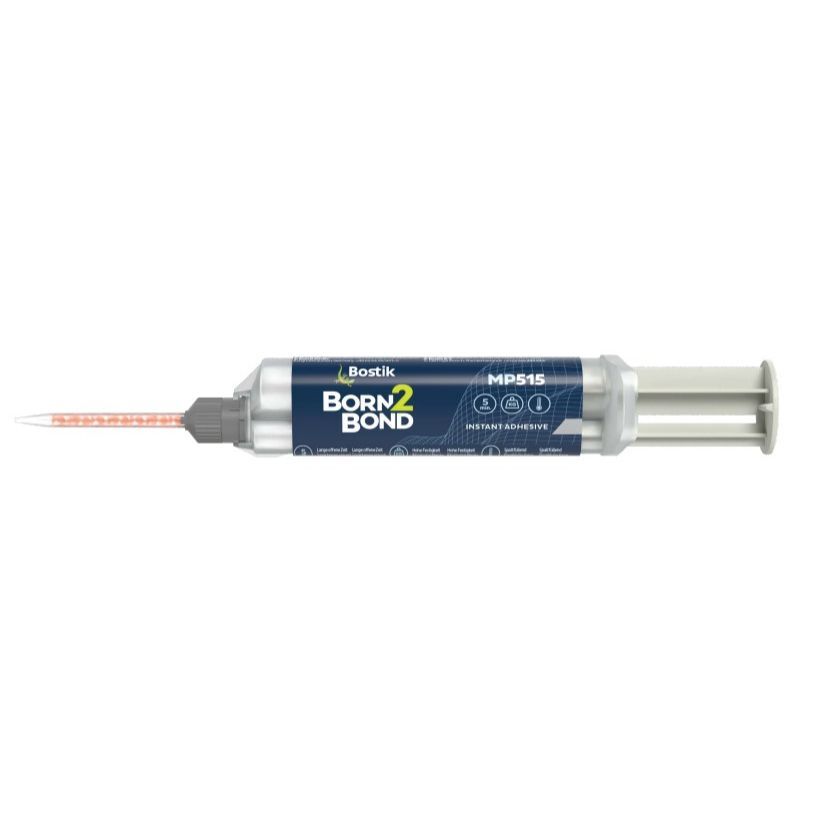 Born2BondTM MP-515 is a two component instant semi-structural adhesive. Its patented technology provides gap filling properties with excellent adhesion to a very broad range of materials and surfaces (including aluminum). Curing time and working time are among 5 and 10 minutes. Born2Bond MP515 has an excellent water heat resistance. The transparent gel consistency enables application in any orientation whilst the static mixing nozzle ensures uniform and precise application for exceptional user convenience.